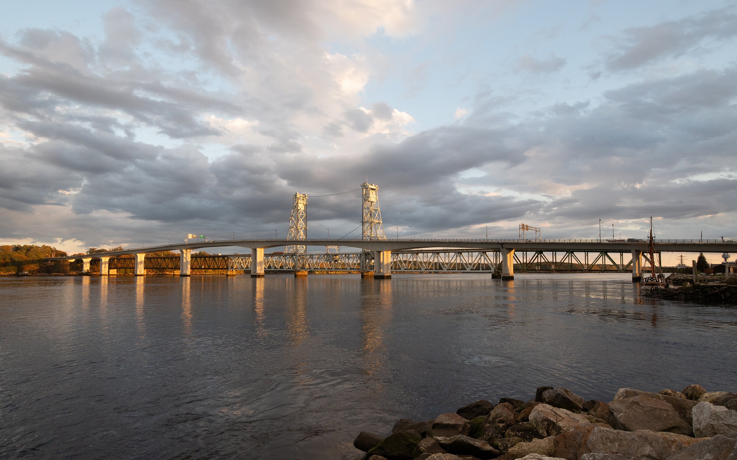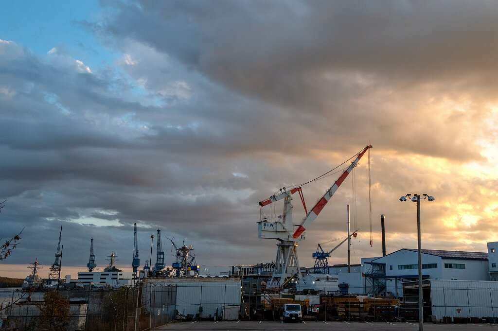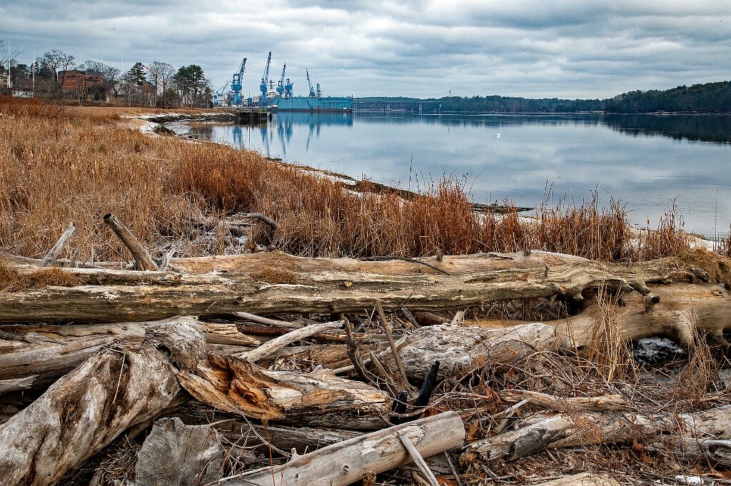 Looking upstream along the Kennebec River towards Bath Iron Works shipyard.