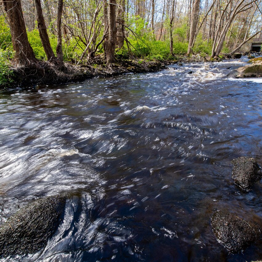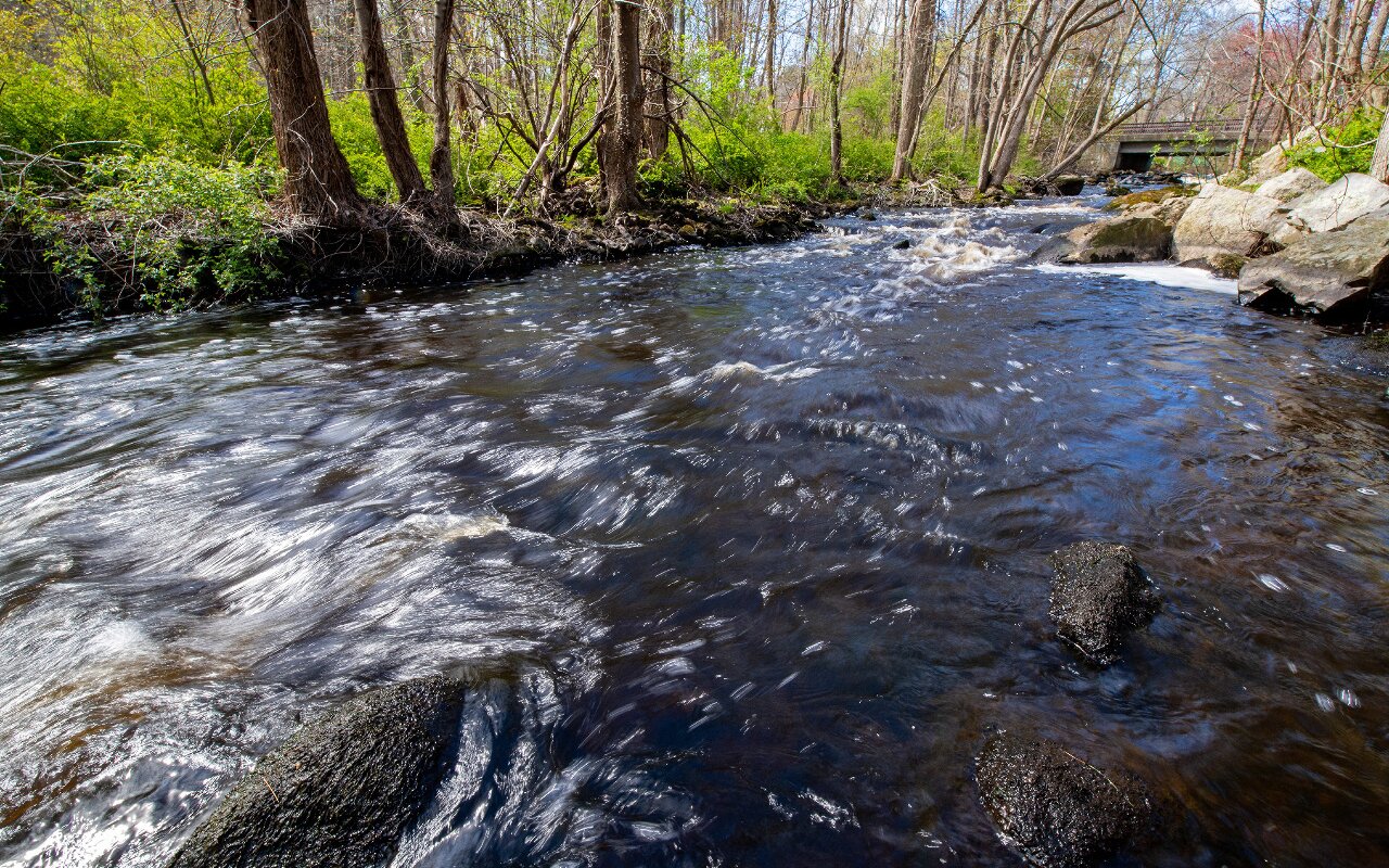 At Rocky Run Conservation area in Hanson. Looking west (upstream) along the Indian Head River at the site of a former dam. June 2022.