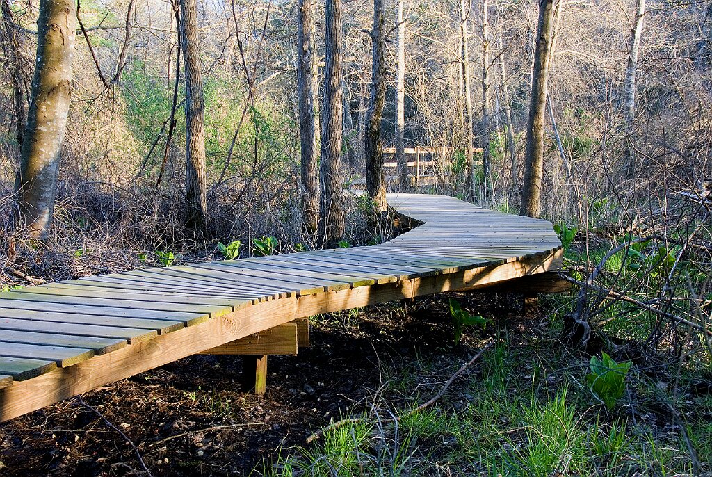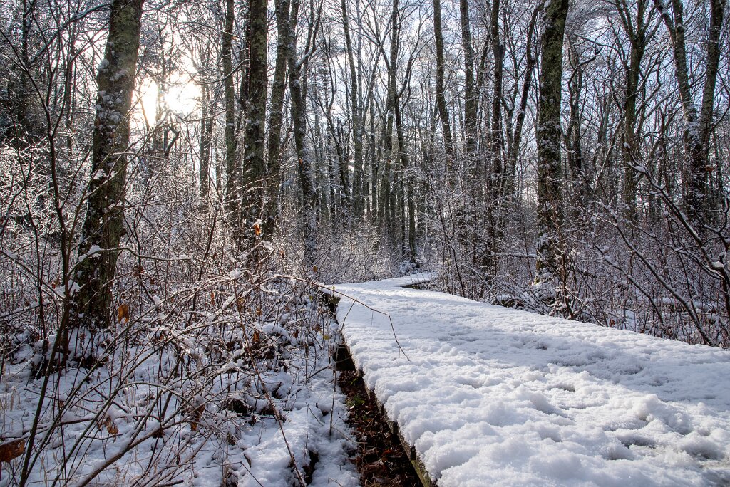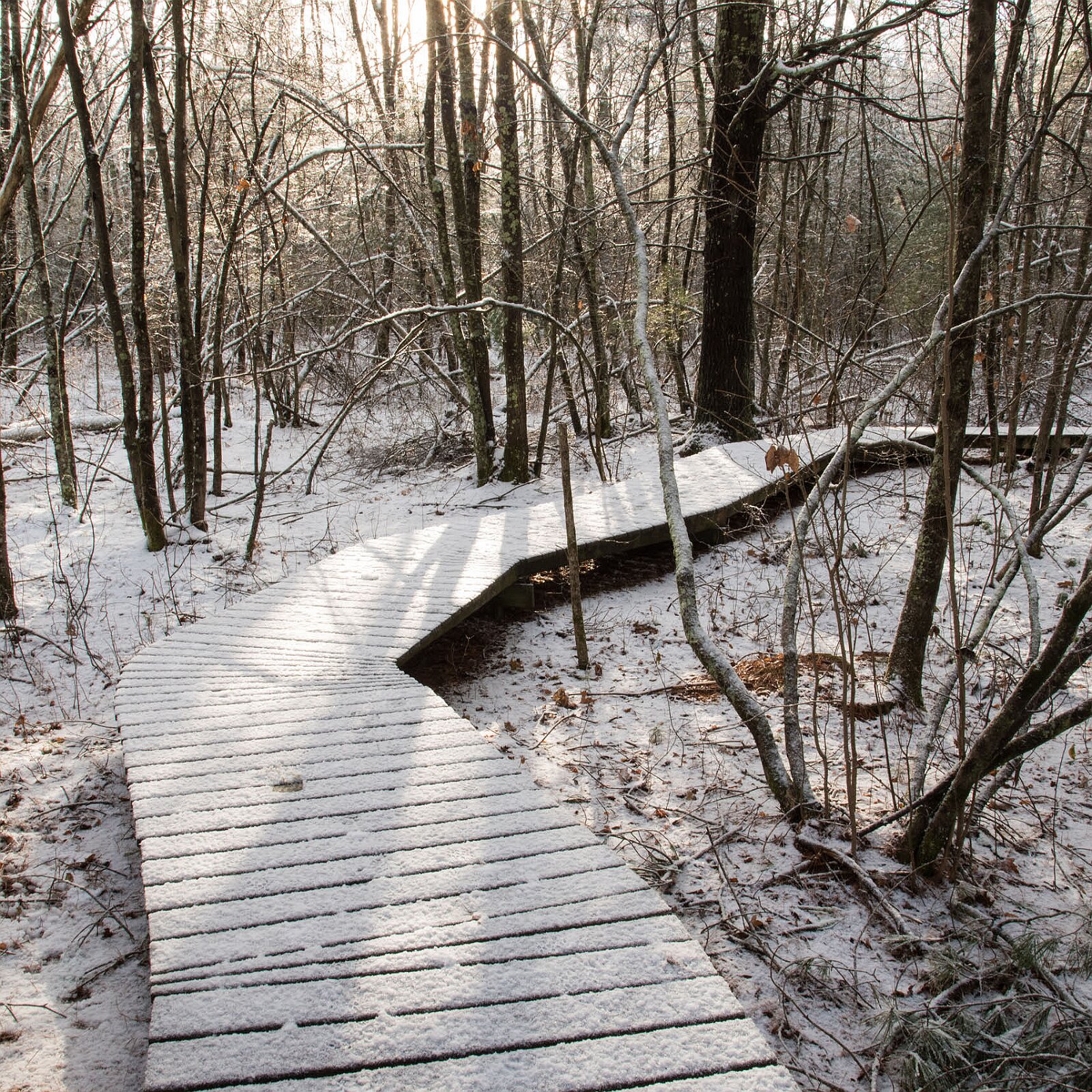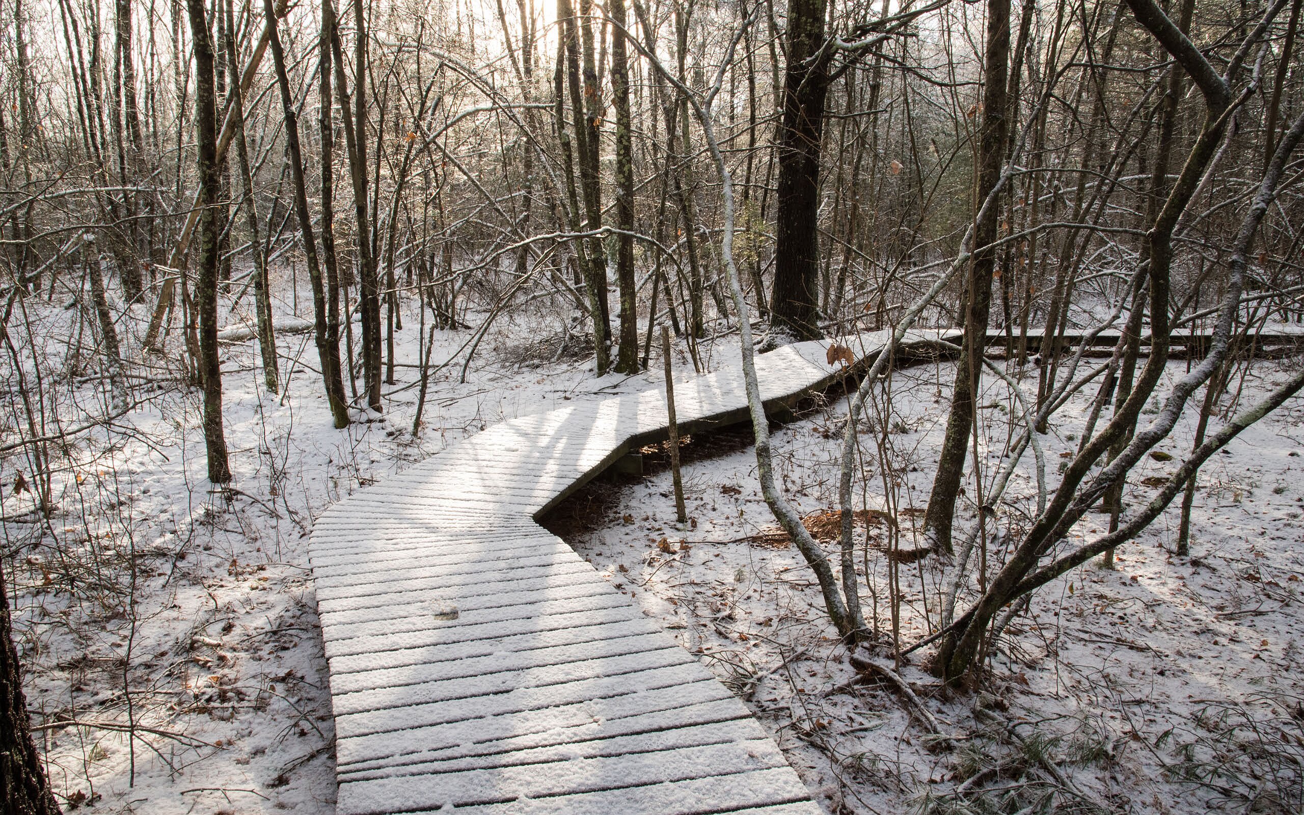 A new bog walk is being installed to replace the aging boardwalk on the Mary and Harry Todd Trail at Willow Brook Preserve. The new system employs tread planks suspended above the substrate and supported by cribbing. This design provides a simplified and resource-efficient structure that is faster to install, requires minimal maintenance, and reduces site disturbance, as no posts or footings are excavated into the ground.